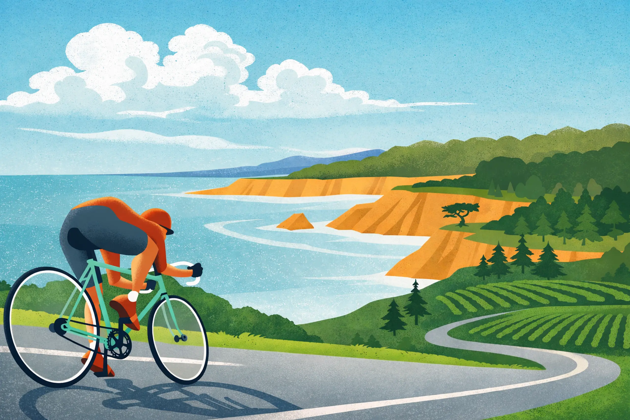 A beautiful coastal ride along iconic Highway 1 and past the historic Piedras Blancas Lighthouse, perfect for enjoying ocean views, moderate terrain, sea breezes, and a chill beach vibe.